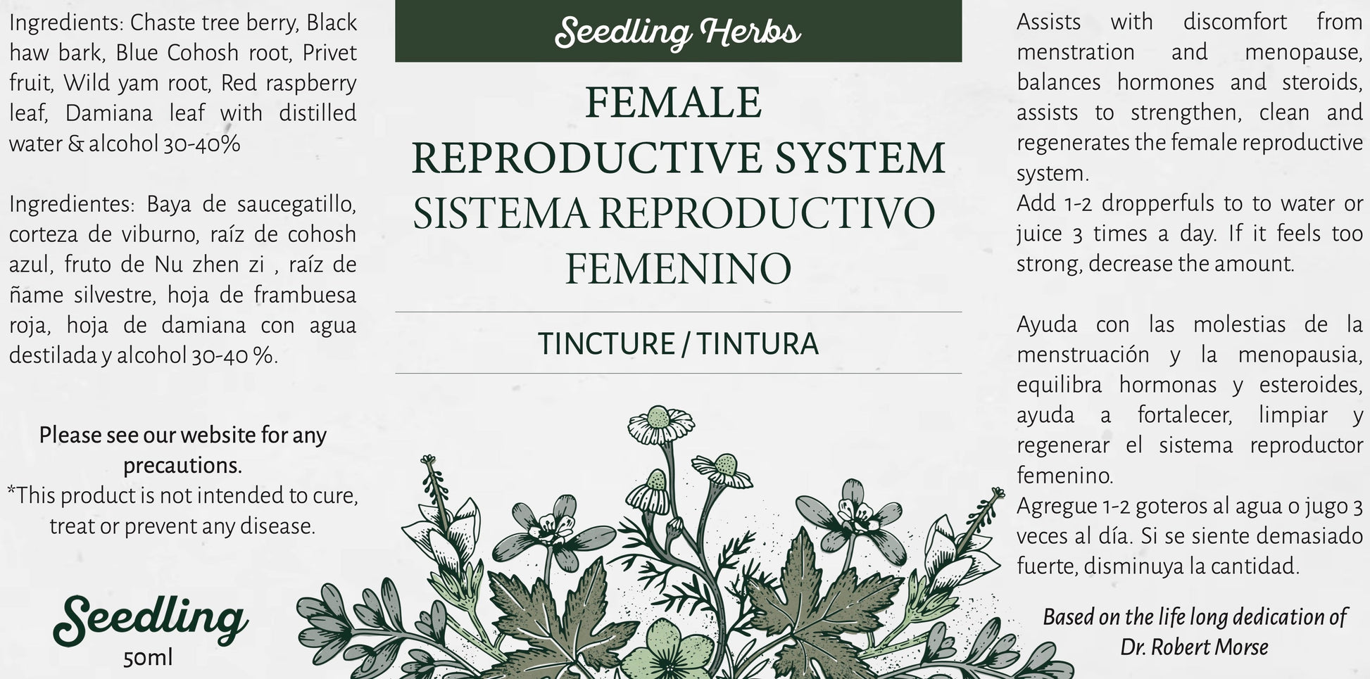 Esta tintura ayuda a equilibrar las hormonas femeninas, especialmente el estrógeno y la progesterona, y favorece un ciclo menstrual regular. Nutre el útero y el sistema reproductivo, contribuyendo a mantener la salud reproductiva general. También favorece la fertilidad y ayuda al cuerpo a prepararse naturalmente para la concepción. La baya del árbol casto ayuda a equilibrar la progesterona y el estrógeno , y favorece la ovulación, mientras que el ñame silvestre proporciona precursores naturales para la producción de progesterona. La hoja de frambuesa roja tonifica el útero y mejora el flujo sanguíneo, favoreciendo un endometrio sano, mientras que el cohosh azul y la corteza de arveja negra fortalecen y mantienen la función uterina. La damiana ayuda a mantener la vitalidad reproductiva general y el equilibrio hormonal.