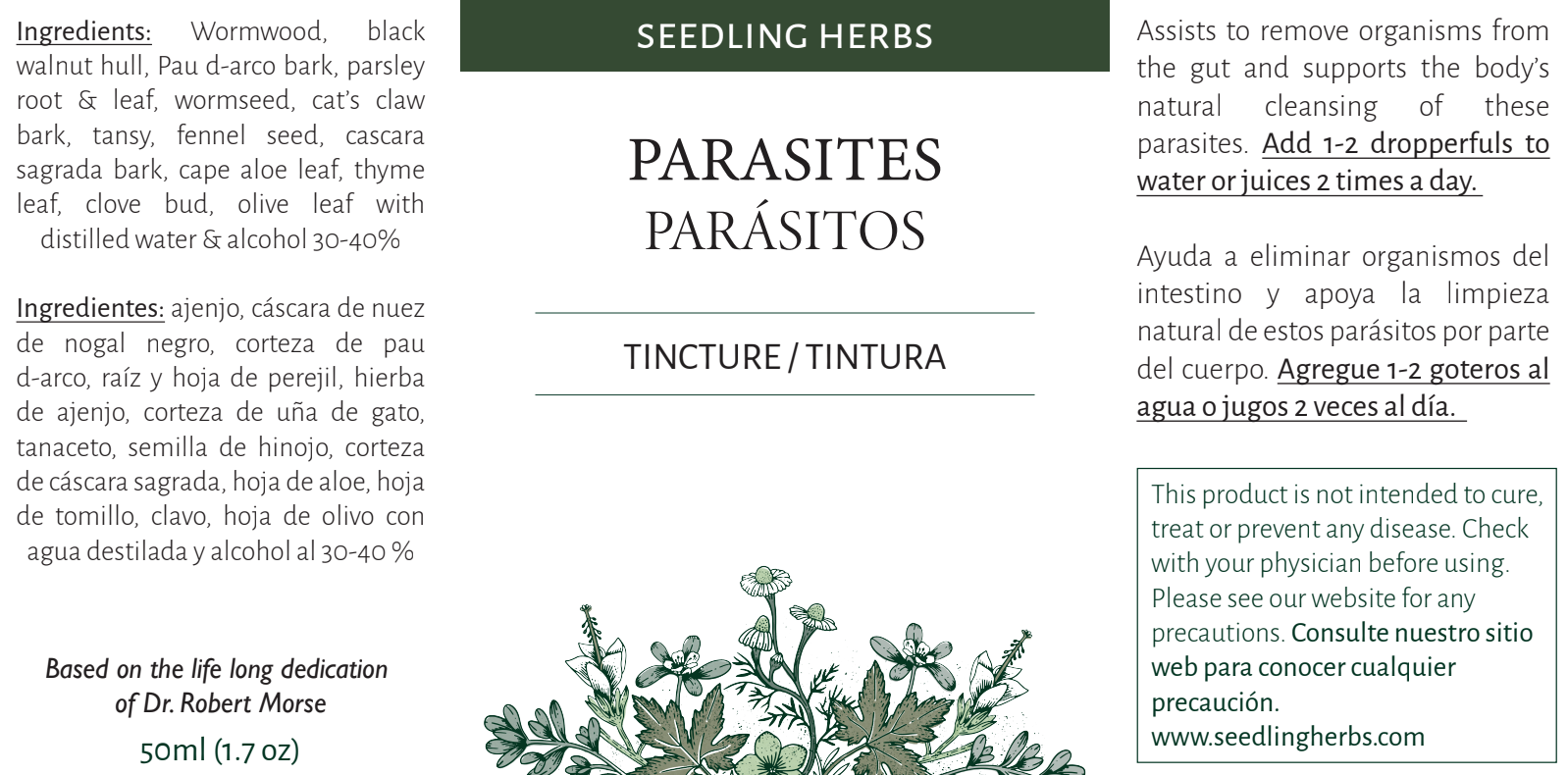 Wormwood herb, black walnut hull, pau d-arco bark, parsley, wormseed herb, cat’s claw bark, tansy herb, fennel seed, cascara sagrada bark, cape aloe leaf, thyme, clove bud, olive leaf extract with distilled water and alcohol 40%, 1:4 herb strength