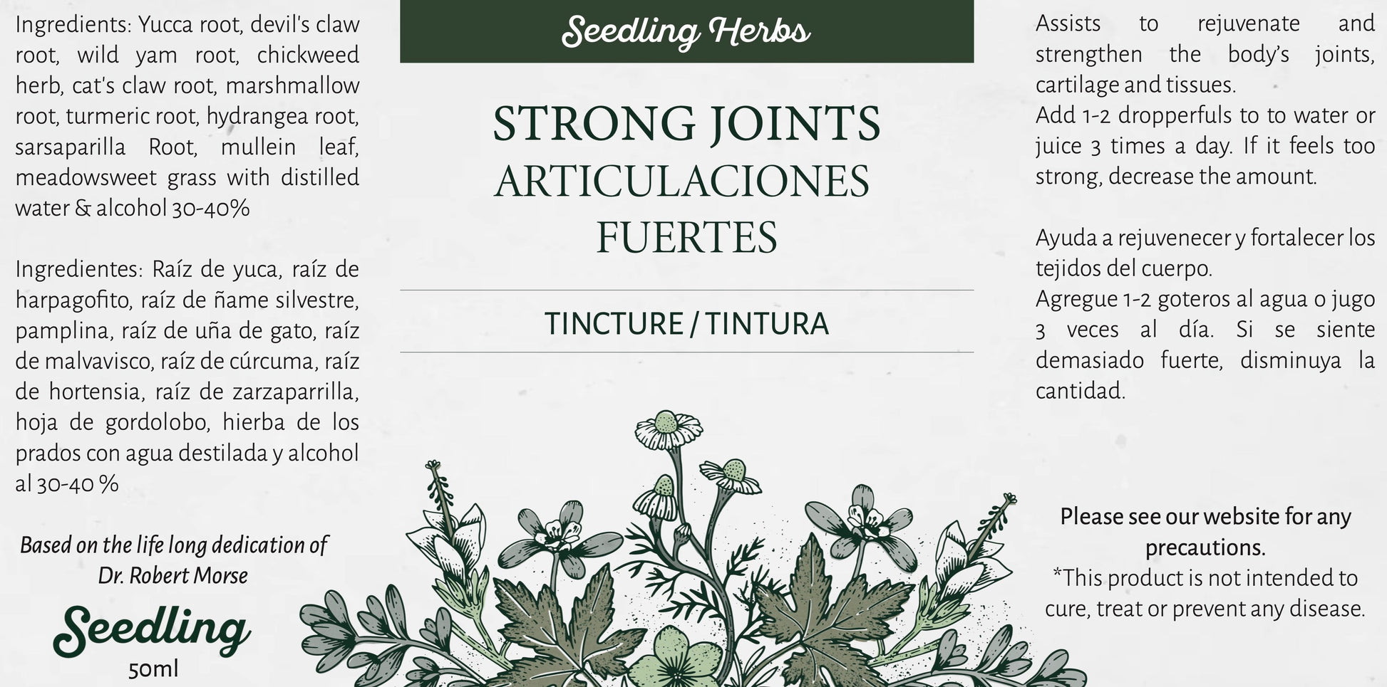 Yucca Root, Devil’s Claw Root, Wild Yam Root, Chickweed Herb, Cat’s Claw Root, Marshmallow Root, Turmeric Root, Hydrangea Root, Sarsaparilla Root, Mullein Leaf, Meadowsweet with distilled water and 50% alcohol, 1:4